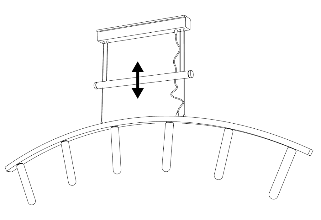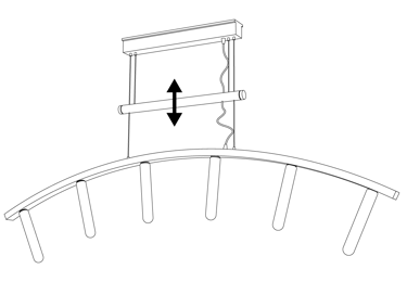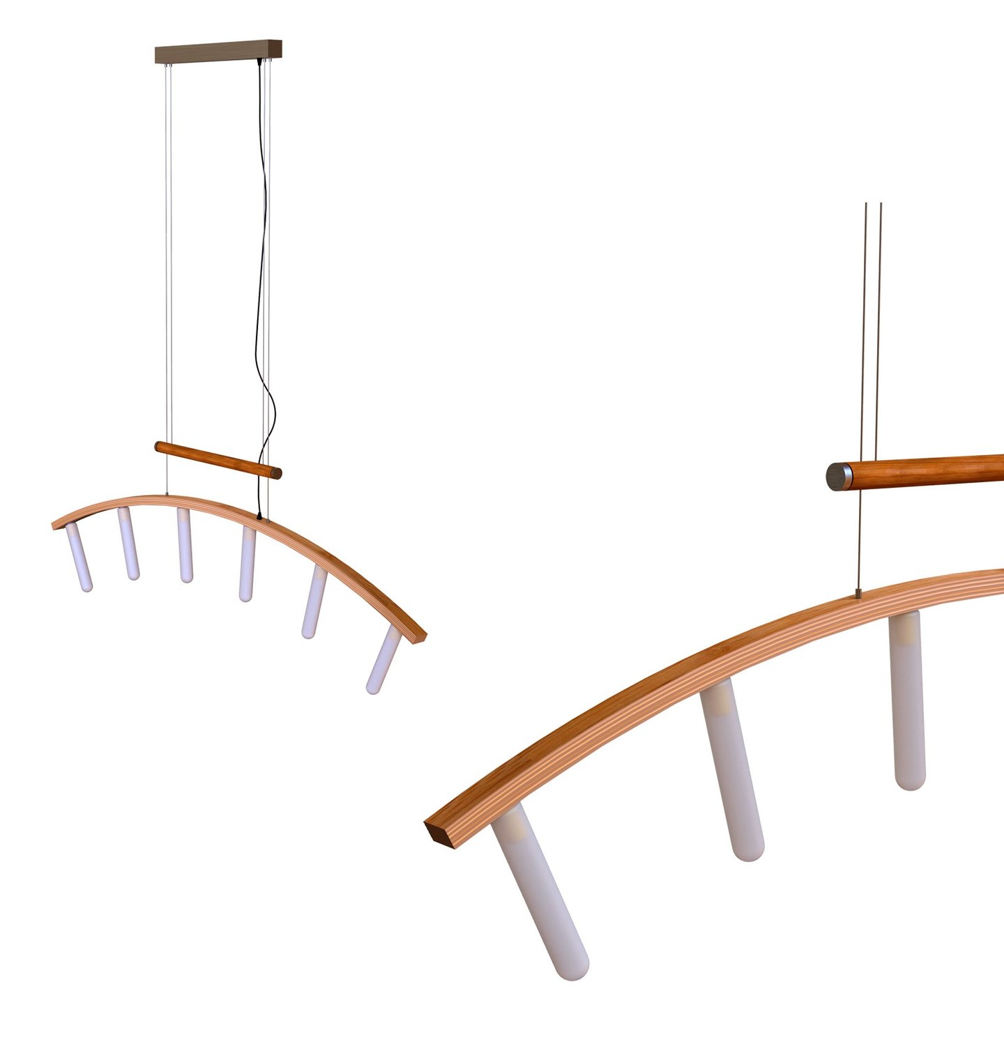 El soporte en forma de arco que sustenta las pantallas está realizado en madera de bambú y tiene una envergadura de 107 cm. Pende del techo mediante dos cables, que pueden recogerse para regular la altura gracias a un tubo, también fabricado en bambú, permitiendo una altura máxima de 180 cm y una mínima de 100 cm.