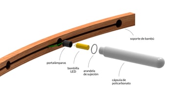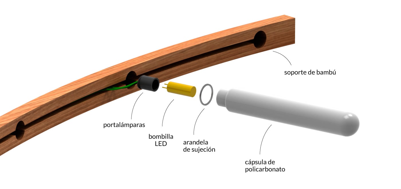 Cada cápsula alberga una lámpara LED. La boca cuenta con un roscado para que, una vez insertada la bombilla y colocada la arandela de sujeción, quede fijada en el portalámparas.