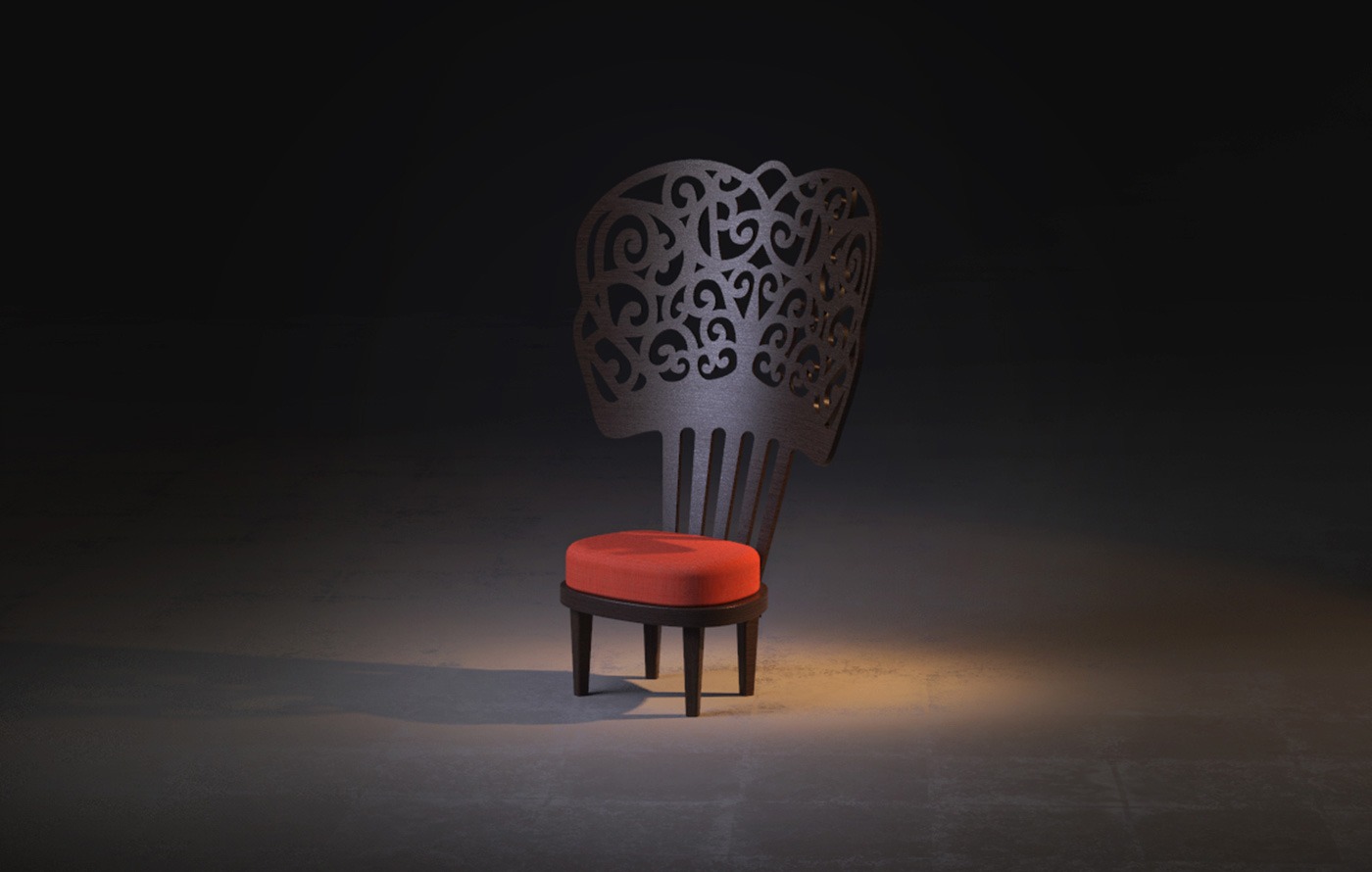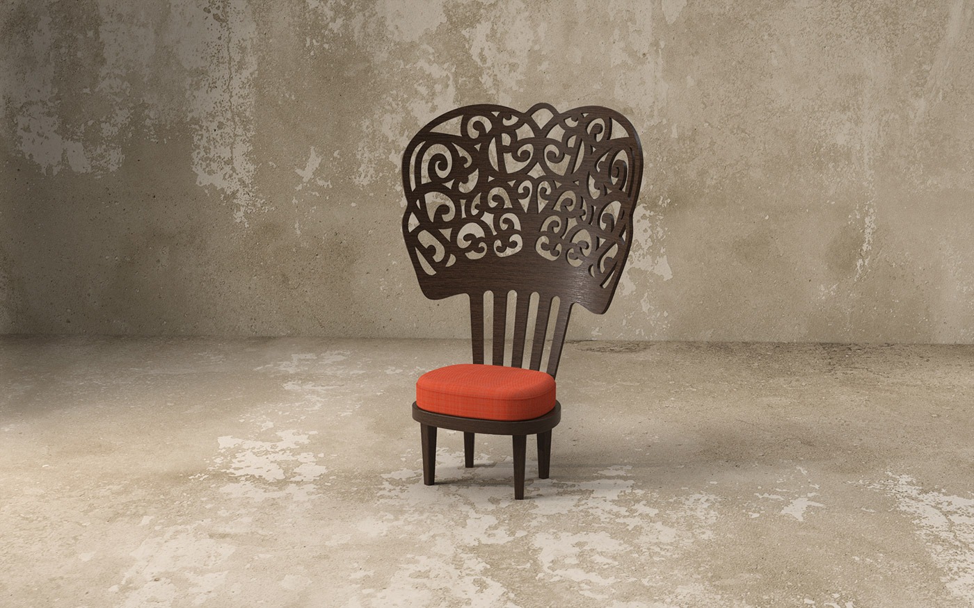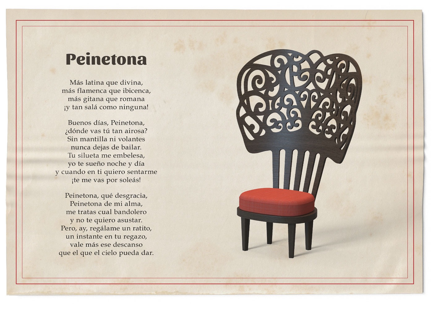 El diseño se apropia de la tradicional e icónica peineta española, dando lugar a una silla folclórica, extravagante y simpática.